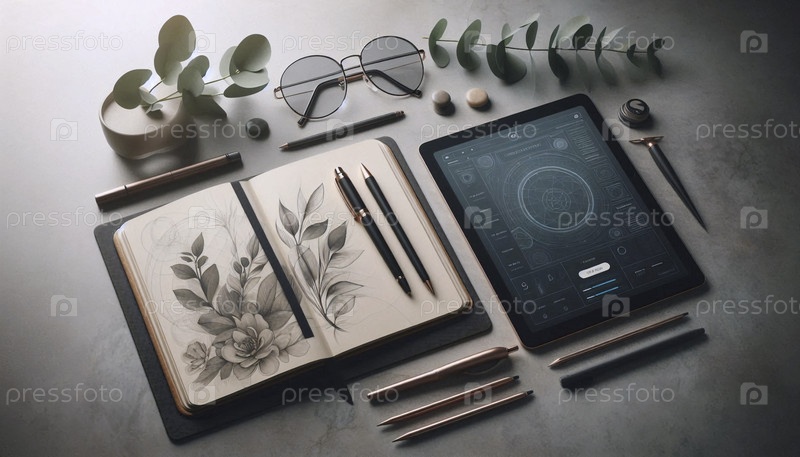Детальный, амбициозный снимок курируемого рабочего пространства для творческого потока, Ai generated image