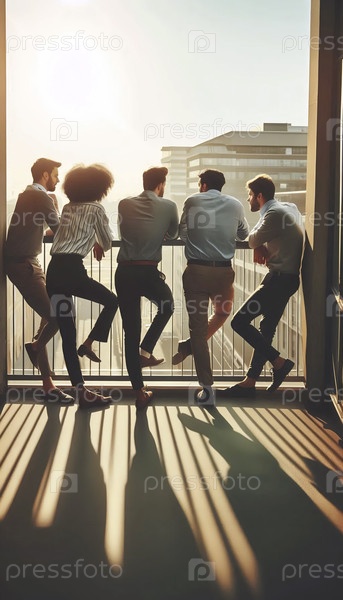 Неформальная стратегическая сессия команды на балконе современного офиса в золотое время, Ai generated image