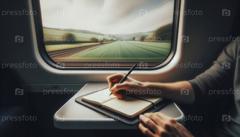 Одинокий писатель находит вдохновение во время поездки на поезде, записывая свои мысли в блокноте против размытого пейзажа, Ai generated image