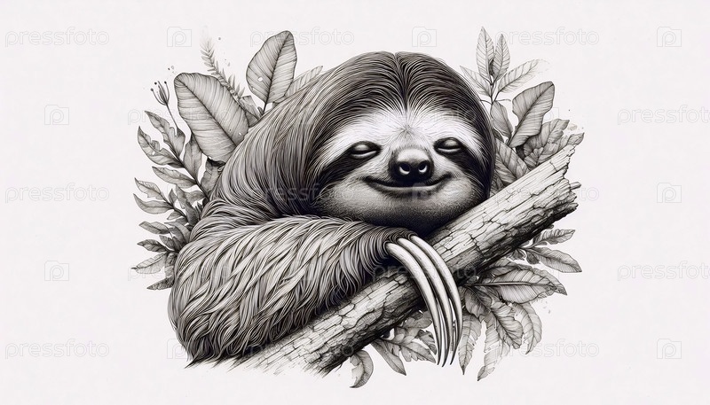 A sleepy sloth ink drawing art print, Ai generated image Спящий ленивец чернила рисует художественный принт, Ай создал изображение