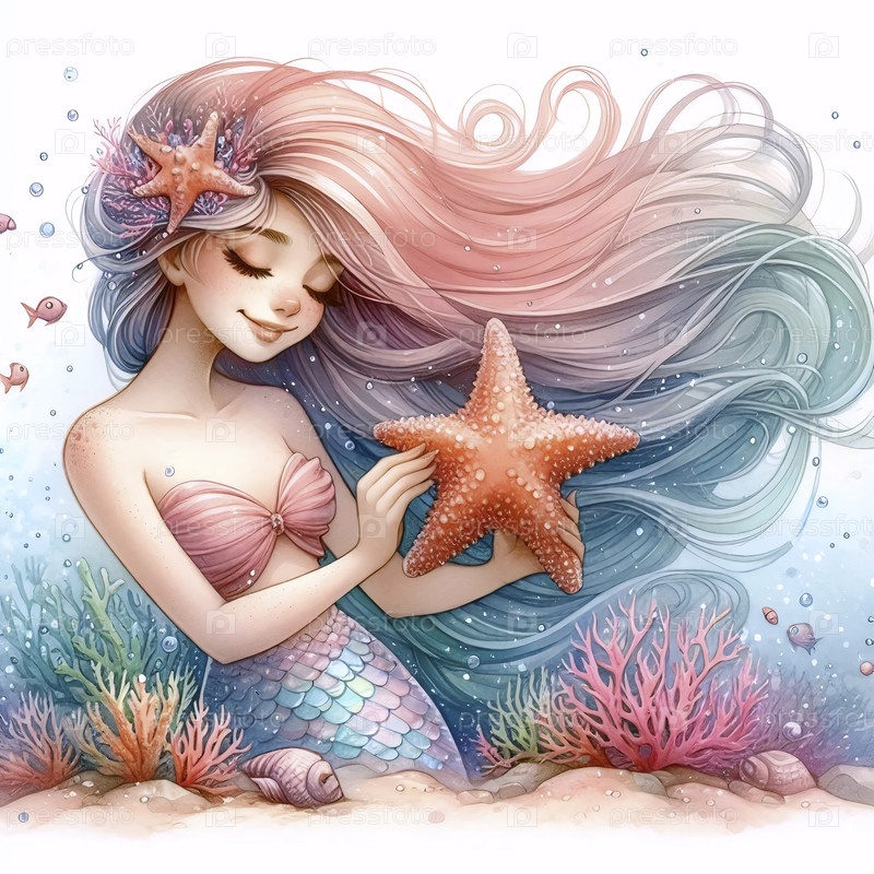Русалка, чистившая волосы акварельной краской из звездной рыбки, Ai generated image
