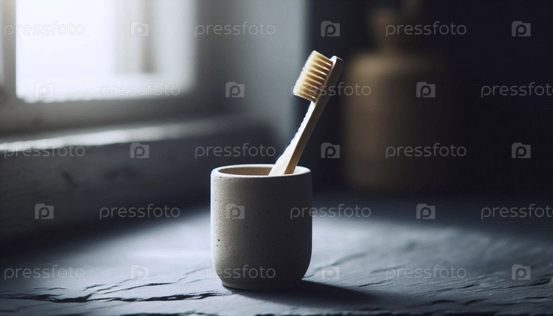 Мокет зубной щетки из бамбука, стоящий прямо в простой сырой глиняной чашке на стеклянном подоконнике, Ai generated image