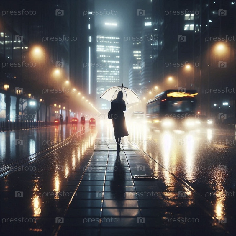 Человек находит утешение и перспективу во время тихой прогулки по дождливому городу, Ai generated image