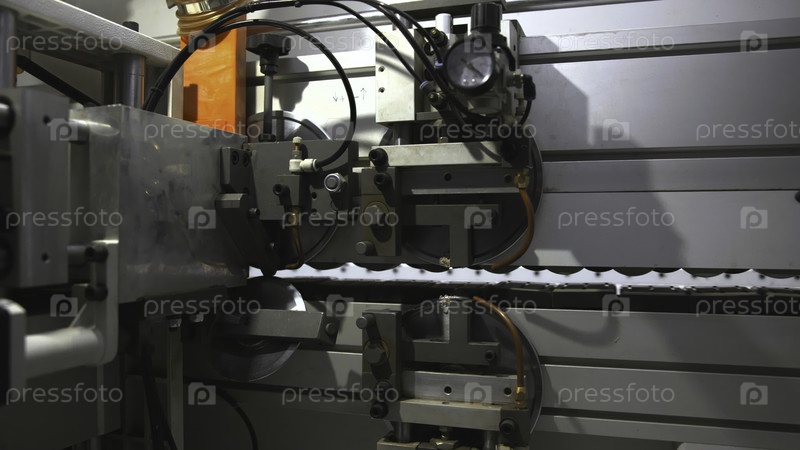 Производственные машины, занимающиеся детальным формированием металла с видимыми следами охлаждающего средства и светильниками.СМИ