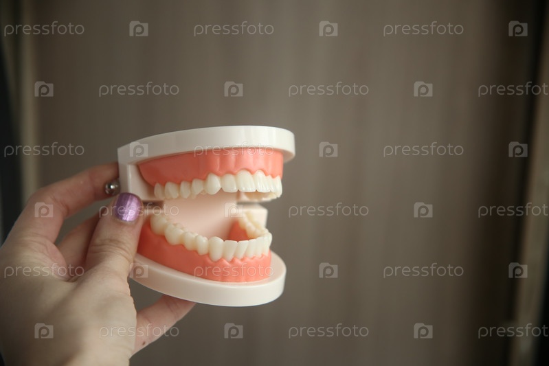 Искусственная человеческая челюсть в руке