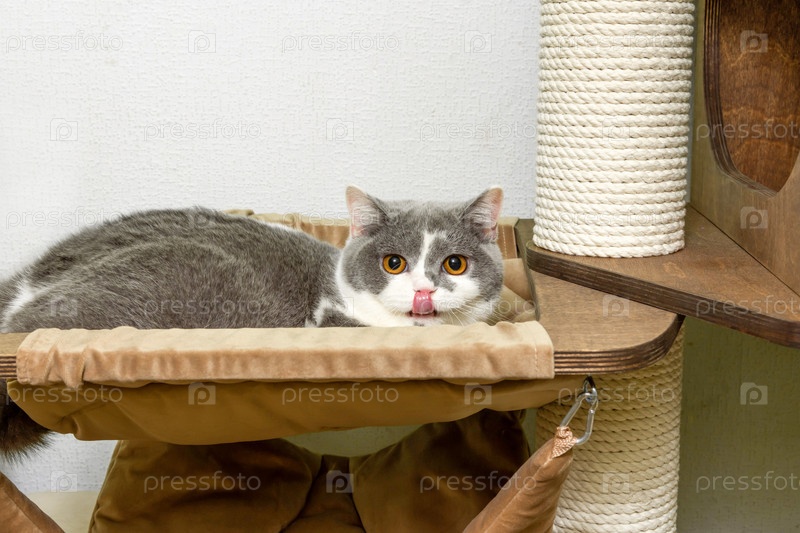 Милый домашний кот британской короткошерстной породы на кошачьем дереве дома