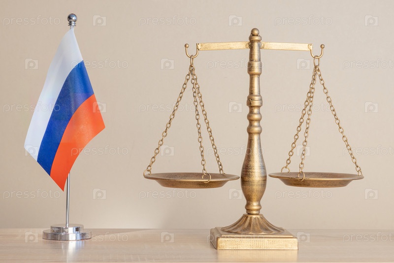 Российский флаг, книги и весы правосудия на столе. Концепция 2026 год