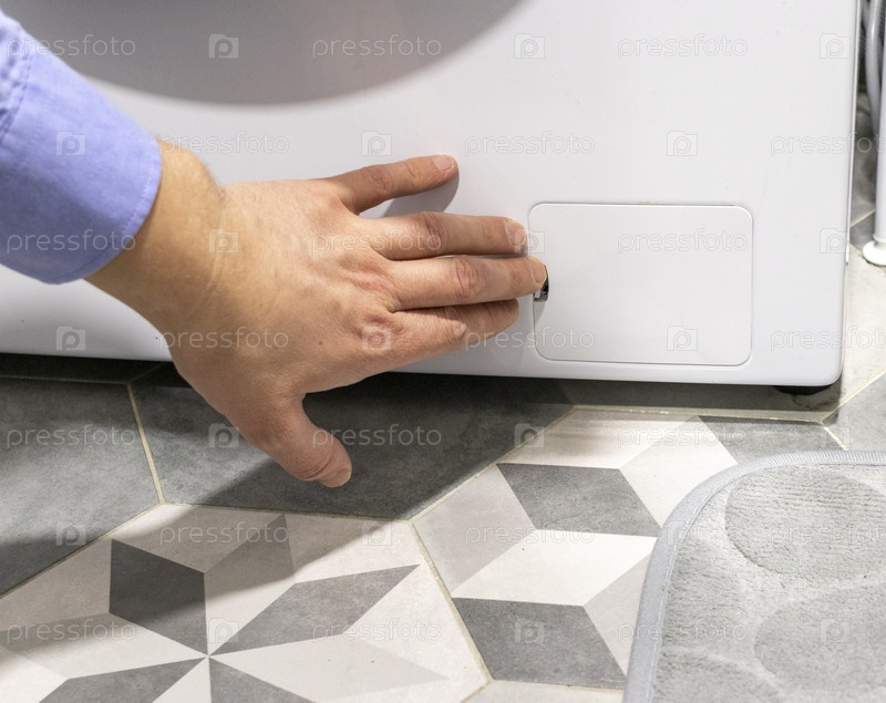 Человек, открывающий панель доступа к фильтру отводного насоса передней загрузочной стиральной машины