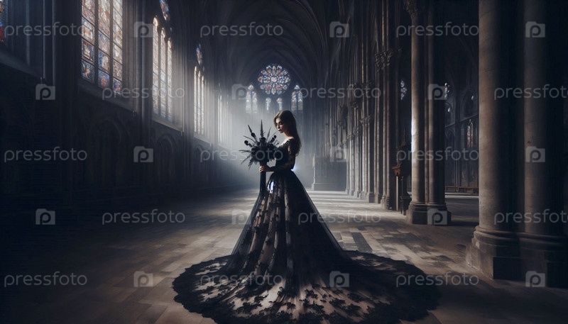 Готическая невеста в черном свадебном платье, Ai generated image