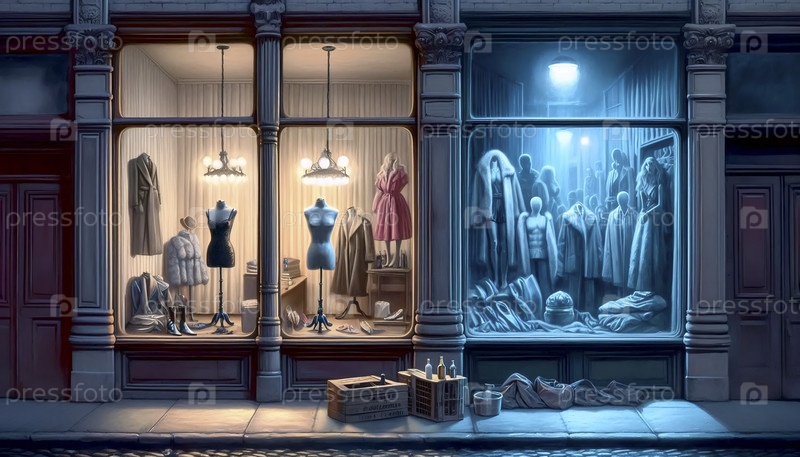 Отражение бедной комнаты в витрине магазина ночью, Ай создал изображение