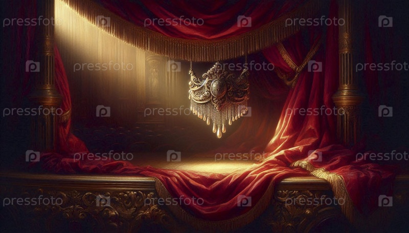 Одинокий, пустой модельный экземпляр люстры с наручными серьгами, висящий из складки темно-красного бархатного бархата в оперной коробке, обтянутой бархатом, Ai generated image