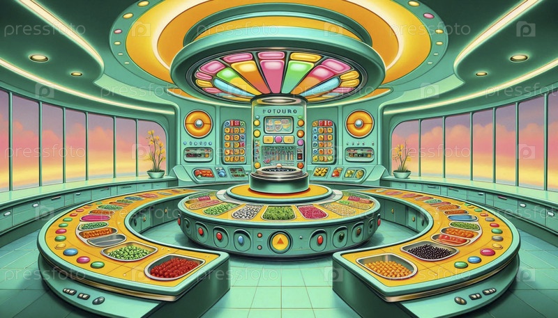 Винтажная кухня будущего с центральной консолью управления и автоматическими приборами для доставки пищи, Ai создал изображение