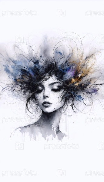 Портрет в очертаниях чернила и волосы акварель, Ai generated image