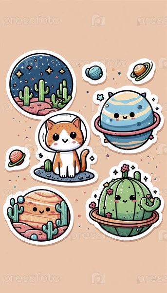 Милый лист наклейки с кошками на разных планетах, Ai generated image