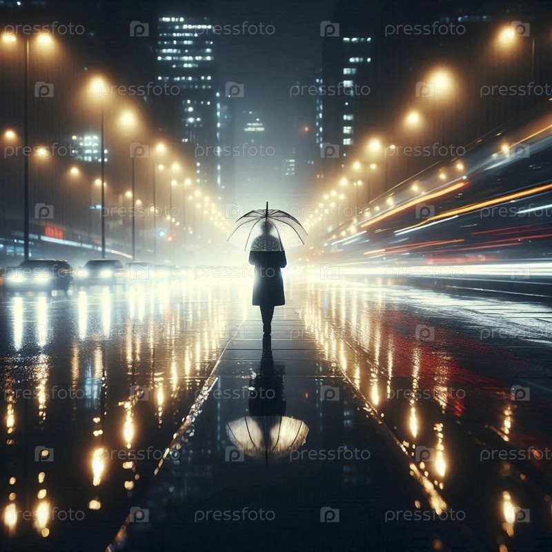 Человек находит утешение и перспективу во время тихой прогулки по дождливому городу, Ai generated image