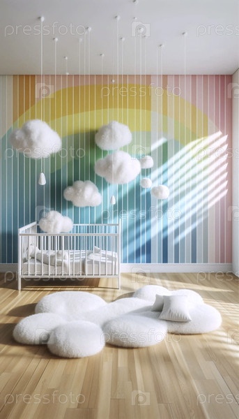 Игровая стена на тему радуги с висящими облаками ткани и пушистым ковром в форме облака, Ai создала изображение