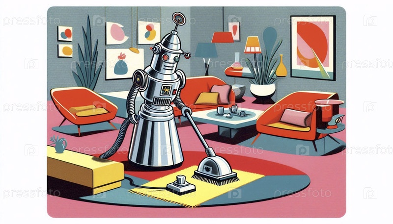 Роботизированный дворецкий с коническим телом, головой радиолокационной тарелки и роликовыми ногами пылесосит затонувшую гостиную