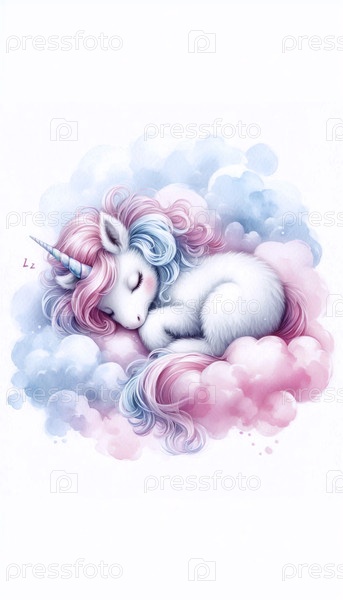 Единорог спит на облаке акварельный художественный отпечаток, Ai generated image