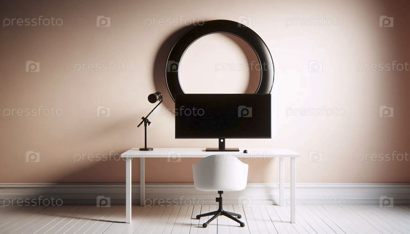 Минималистский белый макет рабочего стола с большим кольцевым светом, отражающимся на пустом экране монитора против пастельной стены, Ai создал изображение