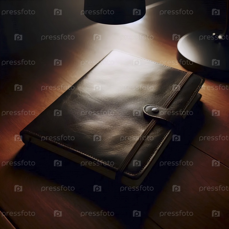 Мокет черного кожаного ноутбука с логотипом слепых, на темном ореховом столе, Ai generated image