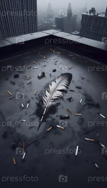 Широкий снимок крыши с перьями в фокусе, за ним городская туманность, Ай создал изображение