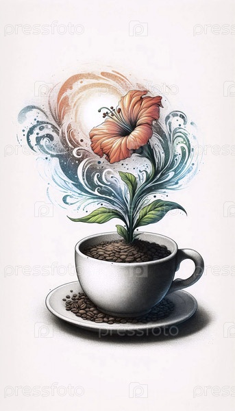Растение в кофейной чашке чернила А рисунок художественная печать, Ai generated image