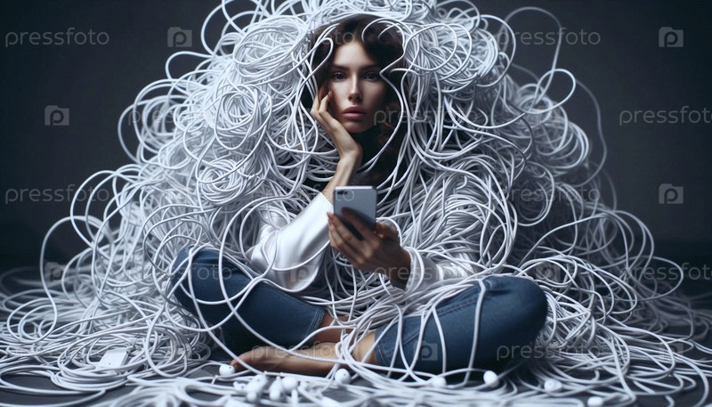 Женщина, запутавшаяся в паутине проводов для наушников, Ai generated image