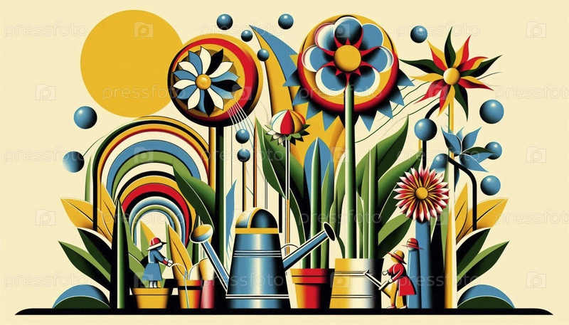 Дети поливают гигантские геометрические цветы, Ai generated image