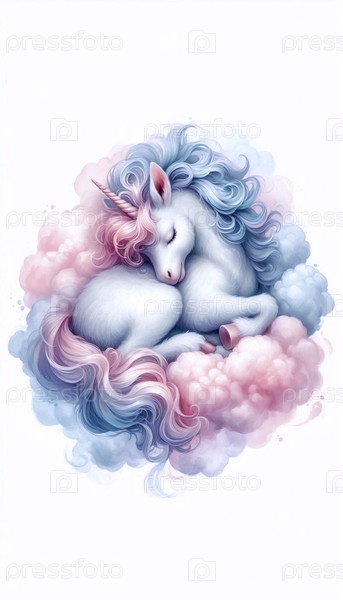 Единорог спит на облаке акварельный художественный отпечаток, Ai generated image