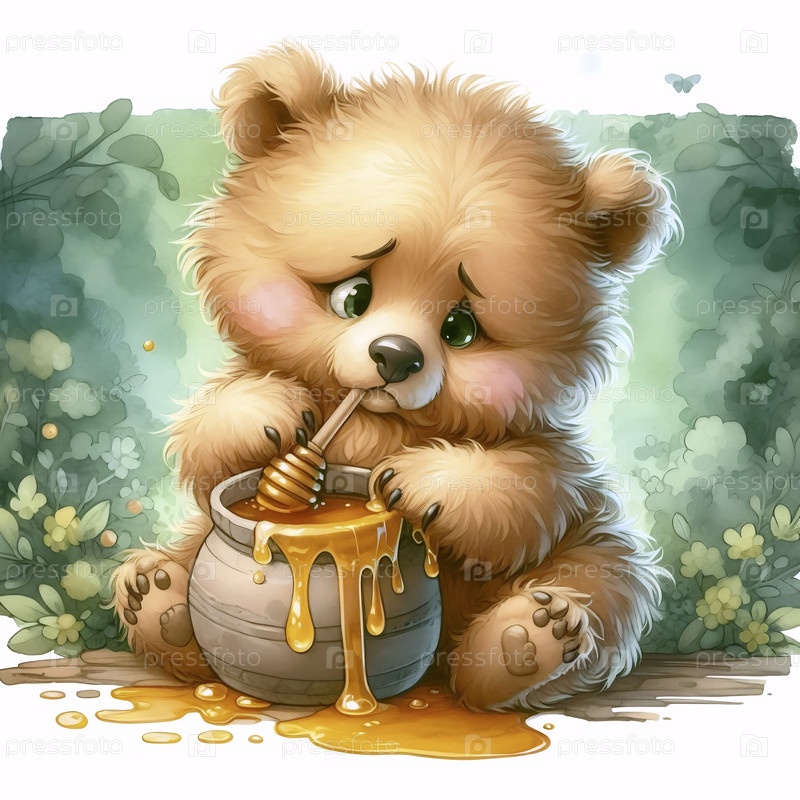 Медвежонок с медовой кастрюлей Акварельный арт-принт, Ai generated image