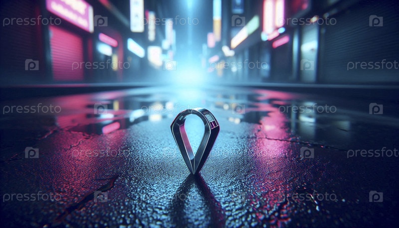 Чистый геометрический макет залога на подвеске, лежащий на дождливом черном асфальте под неоновыми знаками в темной аллее, Ai generated image