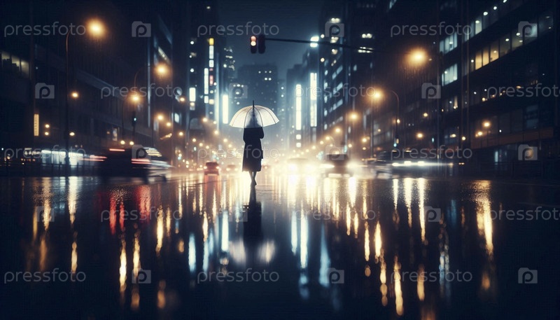 Человек находит утешение и перспективу во время тихой прогулки по дождливому городу, Ai generated image