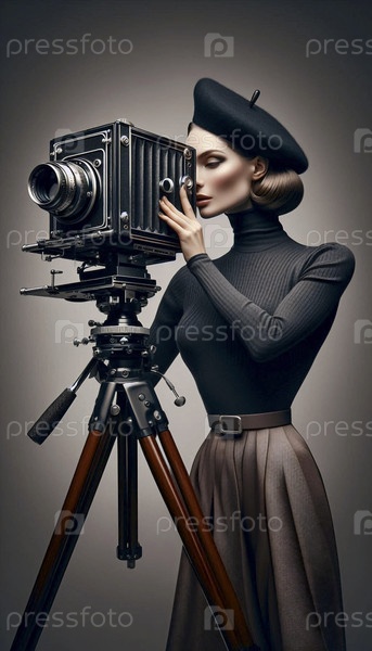 Пин-ап девушка с винтажным фотоаппаратом, фотографирующая себя, Ai generated image