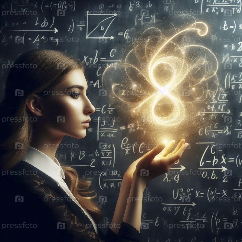 Женщина, окруженная светящимися математическими формулами, Ai generated image