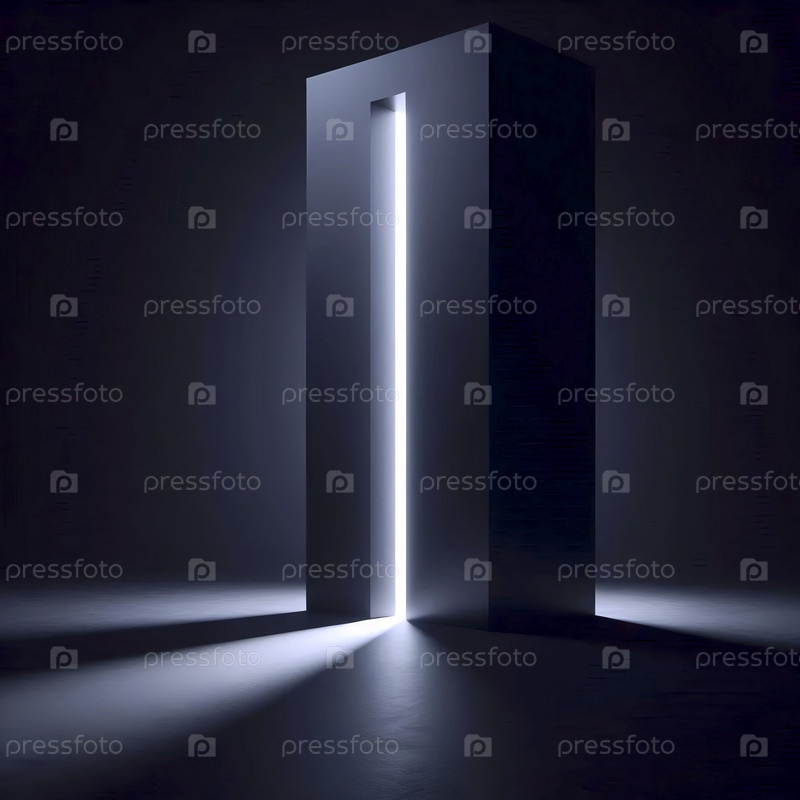 Макет высокой матовой черной цилиндрической колонны в пустом темном пространстве, освещенный вертикальным разрезом света от скрытого источника