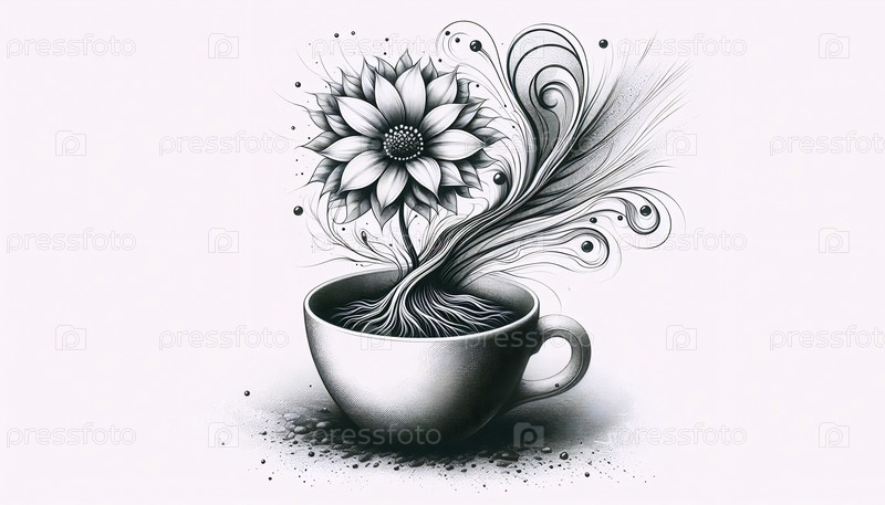 Растение в кофейной чашке чернила А рисунок художественная печать, Ai generated image