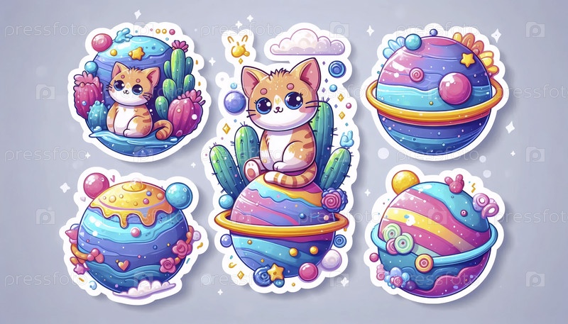 Милый лист наклейки с кошками на разных планетах, Ai generated image