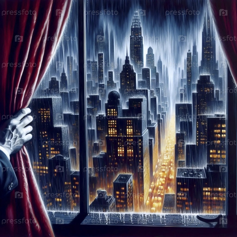 Плакат в живописном стиле из дождливого черного городского пейзажа, Ai generated image