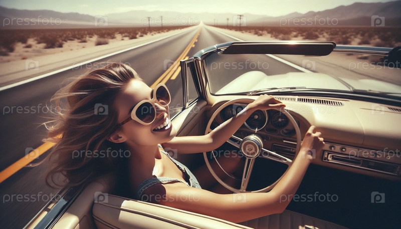 Пустынный драйв в ретро-кабриолет, Ai generated image