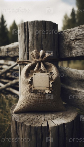 Мокет мешкообразного мешка с пустой маркировкой из прессованных листьев и веревки, опираясь на деревянный столб ограждения, Ai создал изображение
