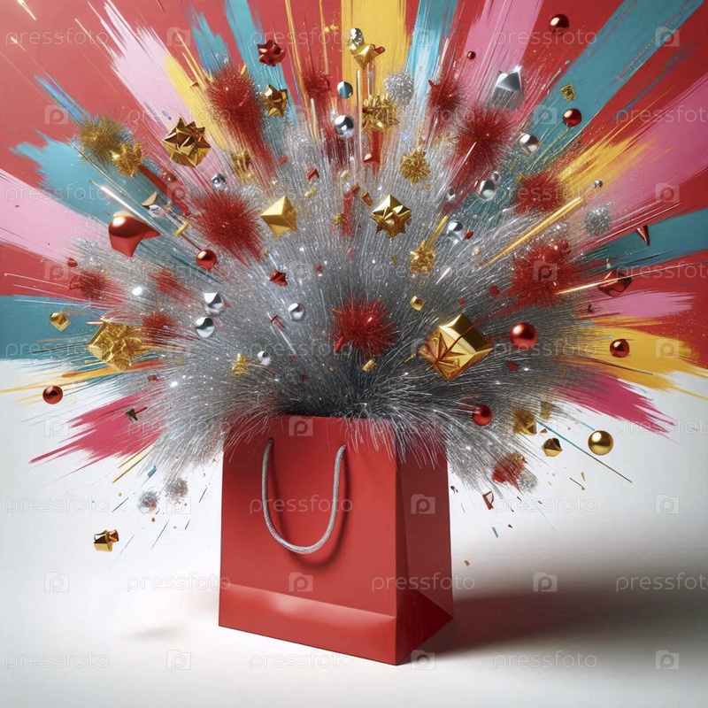 Простой бумажный макет подарочной сумки, переполненный нитями серебряного и золотого тинзеля на красочном абстрактном фоне, Ai создал изображение