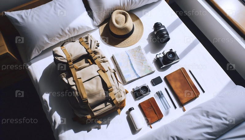 Необходимое оборудование для туристов, выложенное на кровать в общежитии перед днем исследования: карта, шляпа, журнал, бутылка с водой, изображение AI