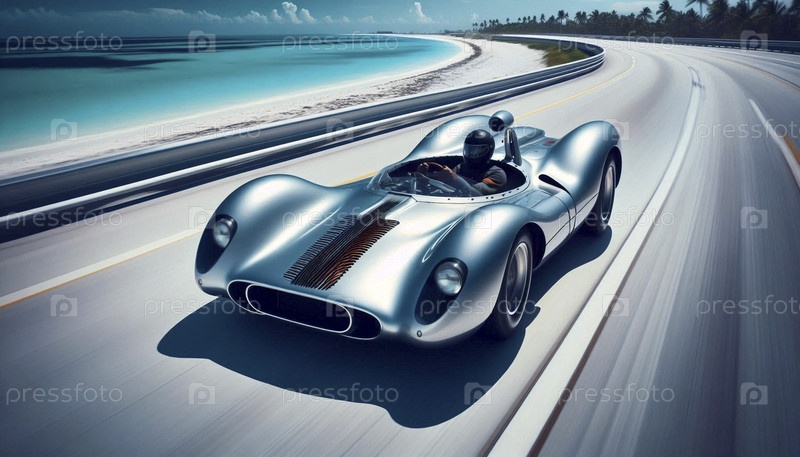 Трехколесный Jetcar с входом турбинового двигателя и одним задней крышкой, ускоряющийся по береговому шоссе, Ai generated image