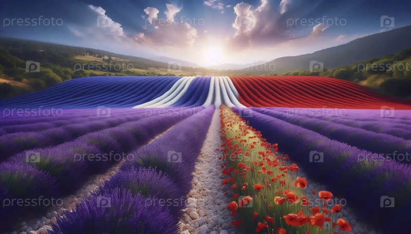 Французский флаг на полях лаванды в Провансе, Ai generated image