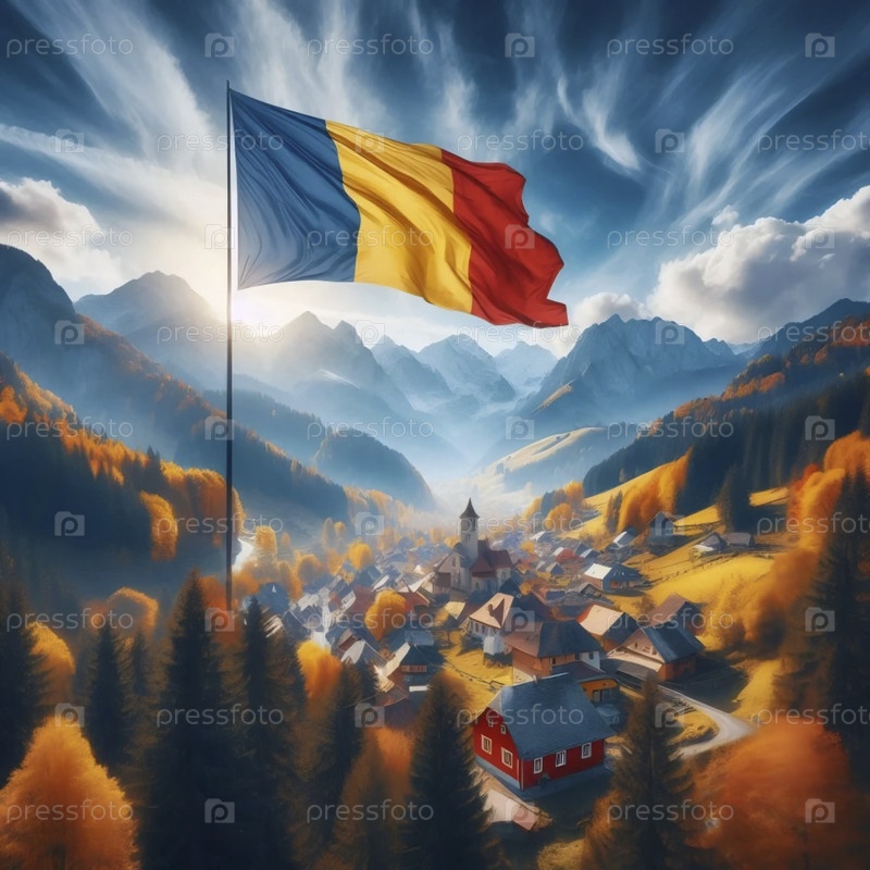 Румынский флаг в карпатском горном пейзаже, Ai generated image