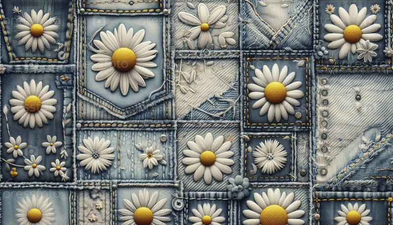 A denim patchwork pattern with Daisy Jeans цветочные мотивы бесшовные, Ai generated image