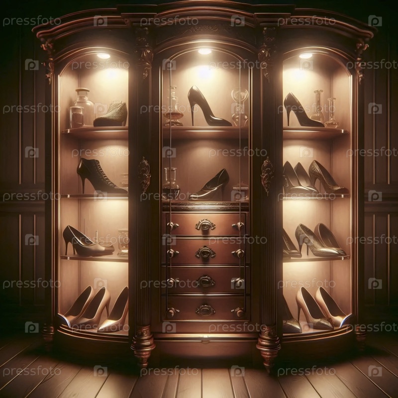 Открытый шкаф с одной обувью на освещенных полках, Ai generated image