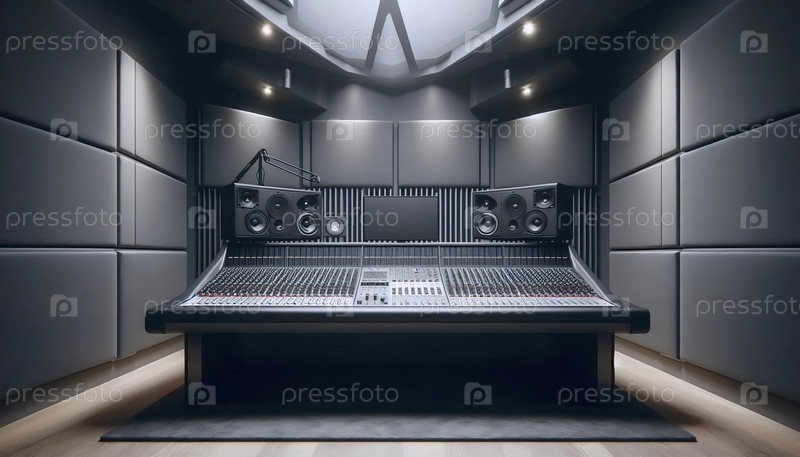 Глубокий макет рабочего стола в студийном стиле с пустым угловым слотом для консоли смешивания, установленный в комнате со обработанными стенами, Ai generated image