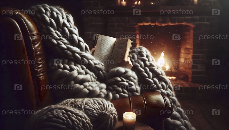 Момент цифровой детоксикации и простой радости, чтение физической книги у трескающегося камина, Ai generated image