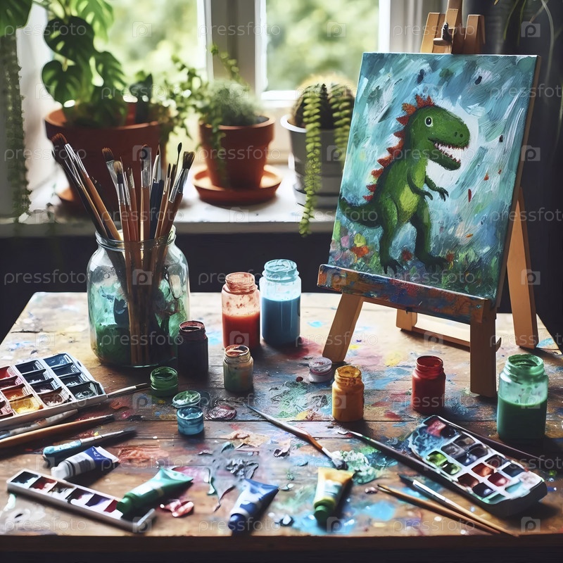Творческая художественная станция: небольшая эстафета с красочной живописью, банки кистей и разлитые акварели, Ай создал изображение